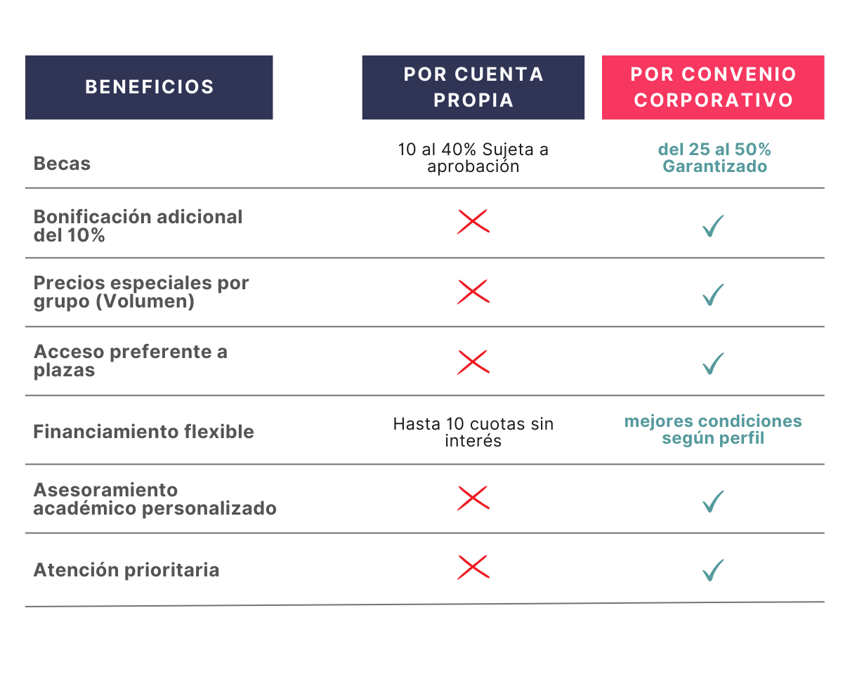 Al acceder a través del convenio corporativo, cada colaborador obtiene condiciones exclusivas que no están disponibles para el público general: becas garantizadas, bonificaciones especiales, asesoramiento personalizado y acceso preferente a una formación de nivel internacional, totalmente compatible con su jornada laboral.